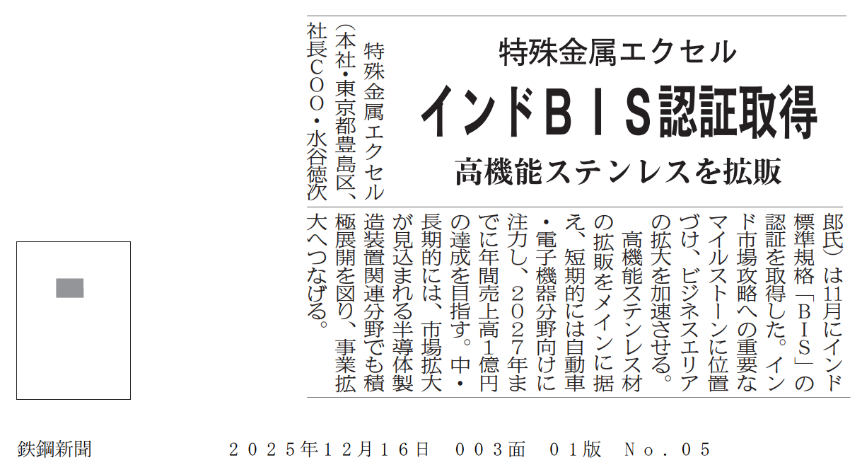 特殊金属エクセル インド標準規格「BIS」認証取得『2025年12月16日 日刊 鉄鋼新聞』