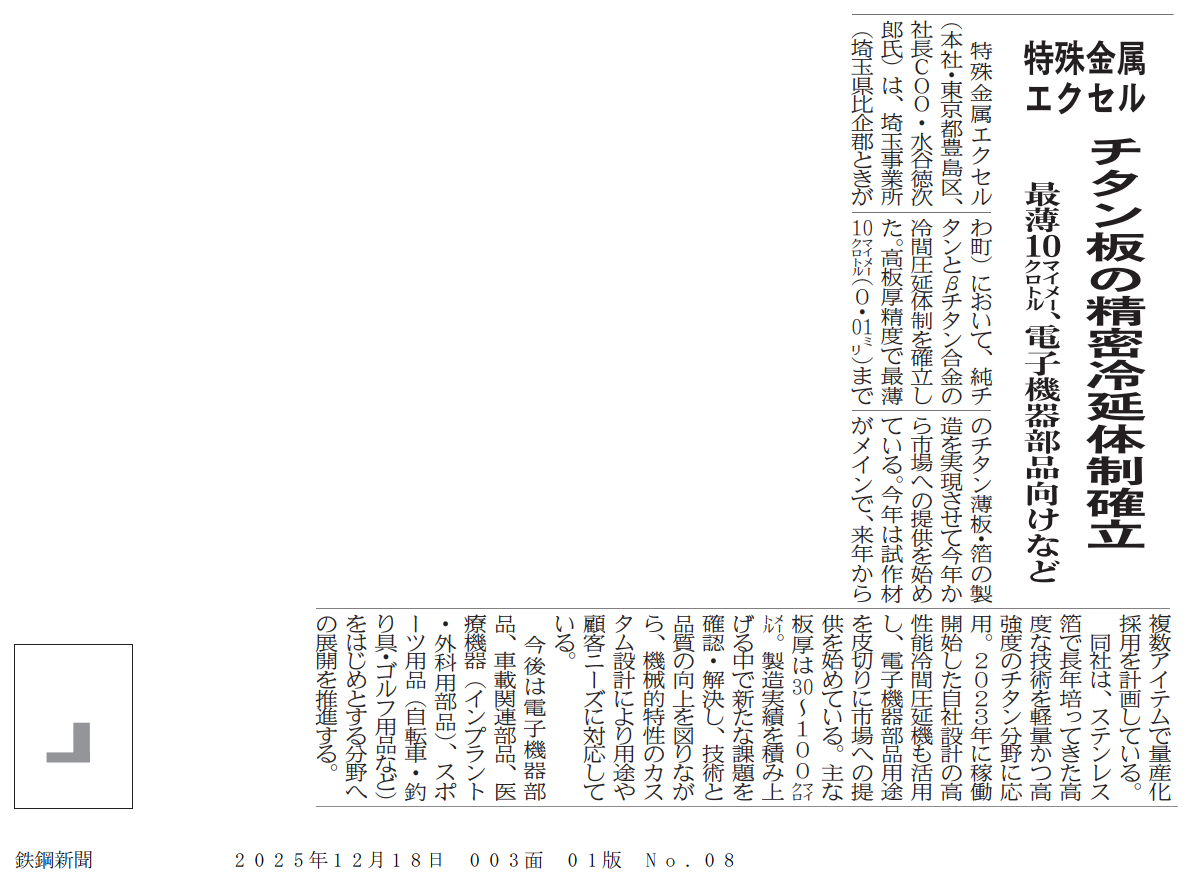 BIS認証取得/極箔量産強化/高強度・高延性ステンレス鋼/チタン材精密冷延 『2025年12月16日~18日 日刊 鉄鋼新聞』|精密金属材料の特殊金属エクセル(TOKKIN)