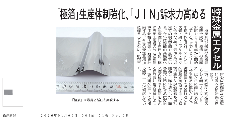<今年期待の商品> 「極箔」生産体制強化、「JIN」訴求力高める 『2026年1月6日 日刊 鉄鋼新聞』|精密金属材料の特殊金属エクセル(TOKKIN)