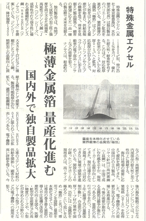 特殊金属エクセル 極薄金属箔 量産化進む『2026年1月19日 日刊 産業新聞』